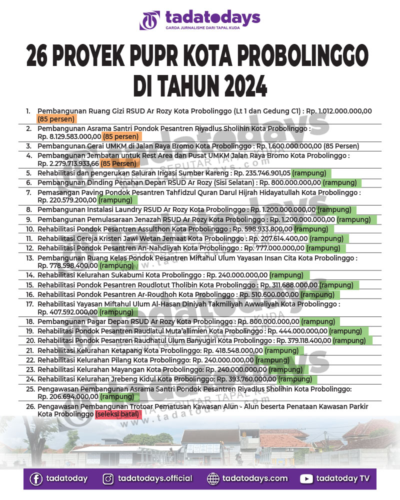 Berdasarkan layanan pengadaan secara elektronik (LPSE) Kota Probolinggo di tahun 2024 ini, memang ada 26 paket pengerjaan di bawah naungan Dinas PUPR Perkim Kota Probolinggo.