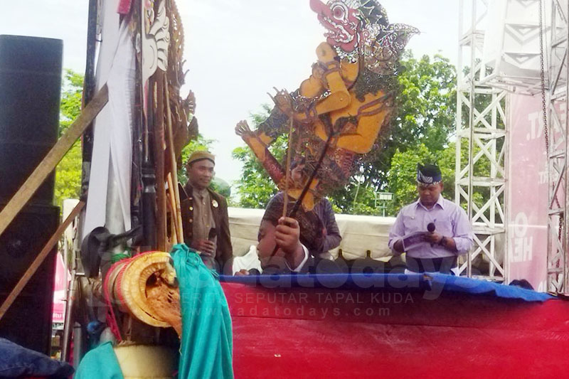 SUARA gamelan terdengar hingga seberang jalan di timur Alun-alun Jember pada Jumat pagi itu. Panggung besar berdiri megah di tengah menghadap ke sisi utara. Tampak pula sejumlah orang sedang mementaskan wayang kulit, meski masih pagi.