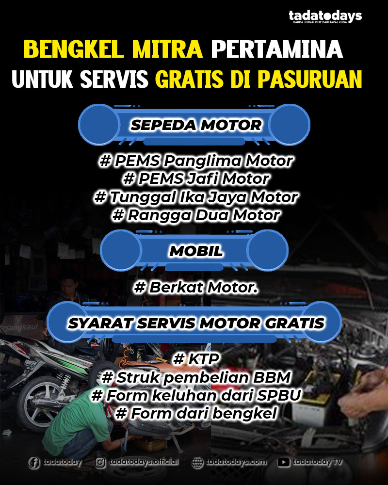 PASURUAN, TADATODAYS.COM - Pertamina Patra Niaga menunjuk 5 bengkel di wilayah Pasuruan untuk memberikan servis gratis bagi warga yang kendaraannya brebet usai diisi BBM. Warga bisa mendapatkan servis gratis asal membawa persyaratan tertentu.