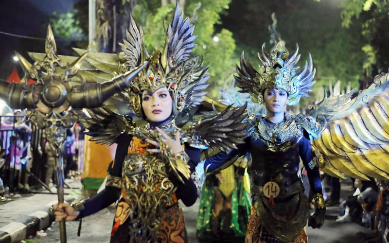 MEMUKAU: Para peserta menampilkan busana yang menarik dengan dandanan atraktif di ajang Batik Lumajang On The Street Night Carnival (Balos).