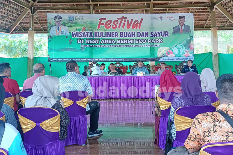PROBOLINGGO, TADATODAYS.COM - Bertempat di Bermi Eco Park (BEP) Krucil, Festival Wisata Kuliner Buah dan Sayur sukses digelar oleh Dinas Kepemudaan, Olahraga, dan Pariwisata Kabupaten Probolinggo, Sabtu (5/11/2022). Ajang kreasi kuliner berbahan buah dan sayur tersebut diikuti 14 desa se-Kecamatan Krucil. Dari festival ini diharapkan, ke depan seluruh desa di Kecamatan Krucil saling membantu memunculkan potensi untuk maju bersama.