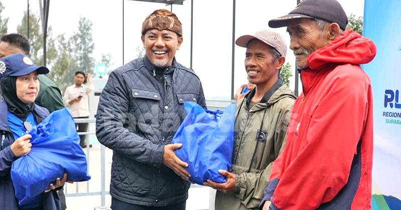 BANTUAN SOSIAL: Bupati Probolinggo, Gus dr. Moh. Haris secara simbolis menyerahkan paket sembako kepada salah satu warga Tengger Bromo.