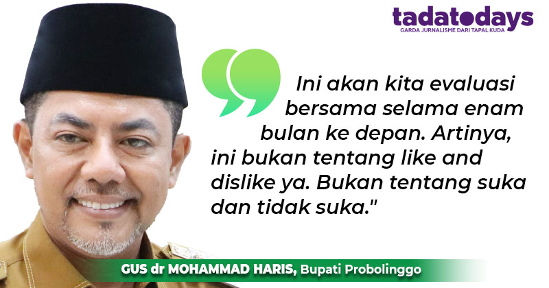 Selanjutnya, Gus Haris menyatakan, bersama Ra Wabup Fahmi, selama ini cukup menjaga jarak dengan para pejabat di lingkungan Pemkab Probolinggo. "Jadi saya berharap tidak ada rasa yang cukup memberatkan, tetapi memang ini secara profesional kita harapkan memang hasil dari mapping, profiling teman-teman semua. Dan kita bicarakan dengan Ra Wabup, kita bicarakan dengan Sekda dan semuanya hingga kita sampai dapat format yang terbaik. Jadi bismillah semoga ke depan pemerintahan ini bisa berjalan dengan semakin baik," jelasnya.
