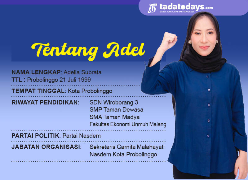 PROBOLINGGO, TADATODAYS.COM - Bagi perempuan cantik asal Kota Probolinggo Adella Subrata ini, dunia politik bukan hal baru. Darah seorang politikus mengalir dalam tubuhnya mengingat sang ayahanda, Slamet Hidayat, adalah seorang politisi Partai Nasdem Kota Probolinggo.