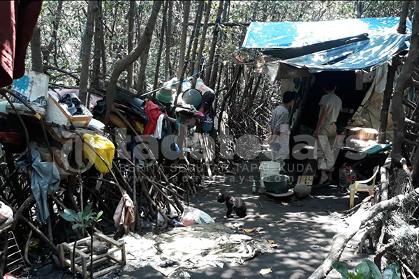 Terlihat, di sekeliling gubuk itu bergantung barang-barang bekas di tiap-tiap akar mangrove. Begitupun barang-barang milik Agus, seperti baju, peralatan mandi hingga peralatan dapur juga digantung di dalam gubuk itu.