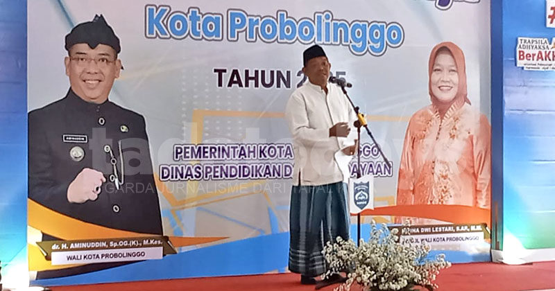 LAPORAN PENYELENGGARA: Kepala Bidang Kebudayaan pada Dinas Pendidikan dan Kebudayaan Kota Probolinggo, Sardi, S.H., melaporkan kegiatan sosialisasi busana pendhalungan pada pembukaan sosialisasi.