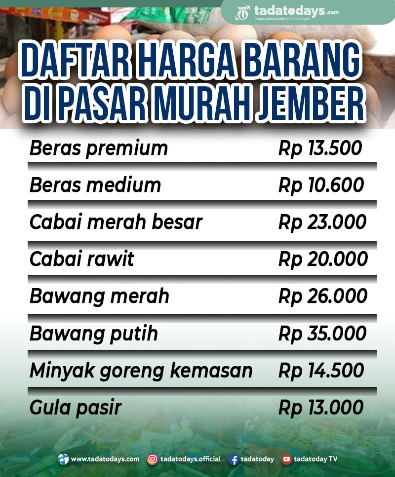 Bagi anda masyarakat Jember yang ingin membeli bahan pokok penting di pasar murah, tidak perlu khawatir ketinggalan jadwal. Selain digelar secara bergantian di 24 kecamatan, pasar murah juga tersedia setiap hari Senin hingga Kamis di tiga pasar tradisional di wilayah kota, yaitu pasar Tanjung, pasar Kreongan, dan pasar Mangli. Untuk memperoleh update jadwal pasar murah, dapat dilihat di Instagram Disperindag Jember @disperindagjember.