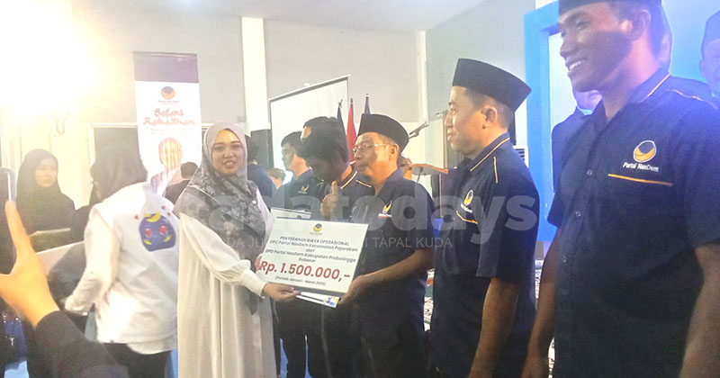 BIAYA OPERASIONAL: Ketua DPD Kabupaten Probolinggo, Hj. Dini Rahmania menyerahkan biaya operasional kepada sejumlah DPC Partai NasDem se Kabupaten Probolinggo.