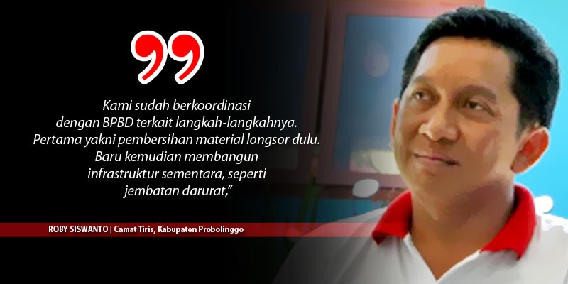 Camat Tiris Roby Siswanto mengatakan, pihaknya akan terus melakukan pembersihan material banjir dan longsor. Baru setelah itu melakukan perbaikan infrastruktur yang rusak. Termasuk rencana membangun jembatan darurat agar memudahkan akses warga.
