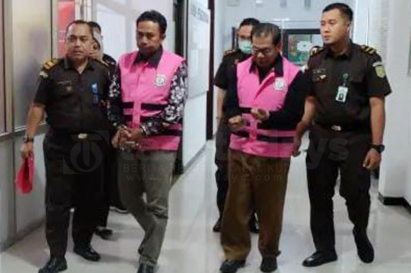DITAHAN: Samsul Muarif (kanan berseragam tahanan) dan BR, saat mulai ditahan oleh Kejaksaan Negeri Jember.