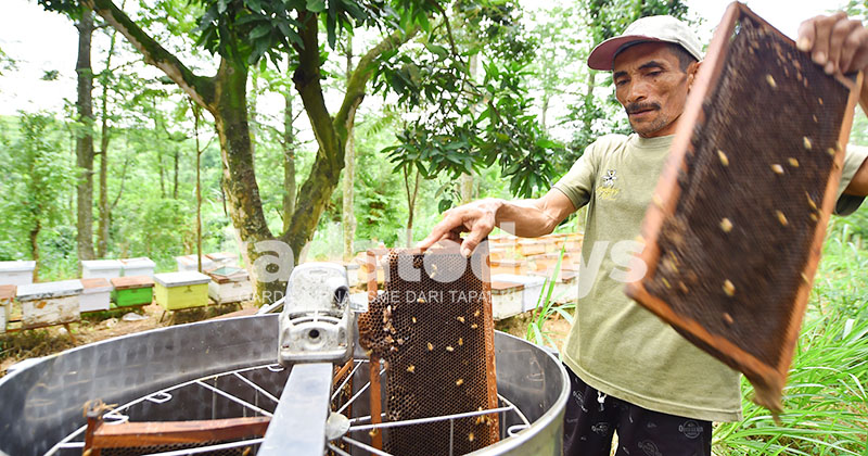 Beberapa lebah masih menempel, tak terusik oleh aktivitas panen pagi itu. Wajahnya serius, matanya teliti memeriksa tiap sudut sarang sebelum memasukkannya ke dalam tabung ekstraktor.