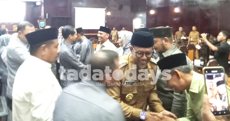 SINERGI: Bupati Probolinggo, Gus dr. Moh. Haris menyapa satu persatu sejumlah anggota DPRD Kabupaten Probolinggo usai Rapat Paripurna tentang Raperda RAPBD TA. 2026.