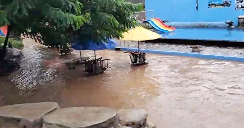 Banjir juga terlihat merendam kolam renang dan fasilitas yang ada di sekitarnya. Air berwarna cokelat pekat mengalir dengan arus yang sangat deras, membawa material lumpur dan puing-puing.