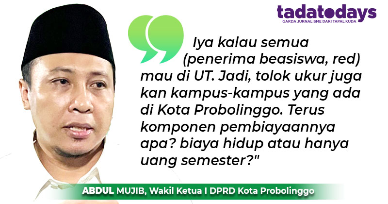 Wakil Ketua I DPRD Kota Probolinggo Abdul Mujib memberikan saran. Menurutnya, kampus pilihan untuk calon siswa tersebut seharusnya tidak hanya Kampus UT. "Iya kalau semua mau di UT. Jadi, tolok ukur juga kan kampus-kampus yang ada di Kota Probolinggo. Terus komponen pembiayaannya apa? biaya hidup atau hanya uang semester?" ujarnya.