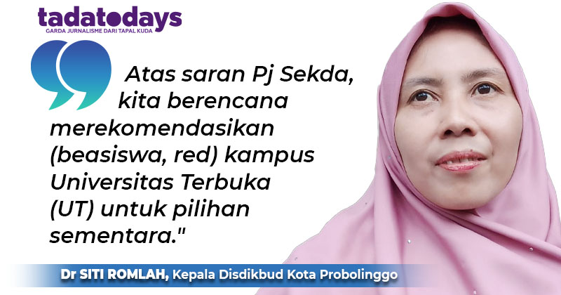 Kepala Disdikbud Kota Probolinggo Siti Romlah menjelaskan, akan ada 500 siswa yang akan diberi beasiswa perguruan tinggi. Kategorinya dari keluarga miskin, mulai dari desil 1 hingga 5. "Atas saran Pj Sekda, kita berencana merekomendasikan (beasiswa, red) kampus Universitas Terbuka (UT) untuk pilihan sementara," ucapnya.