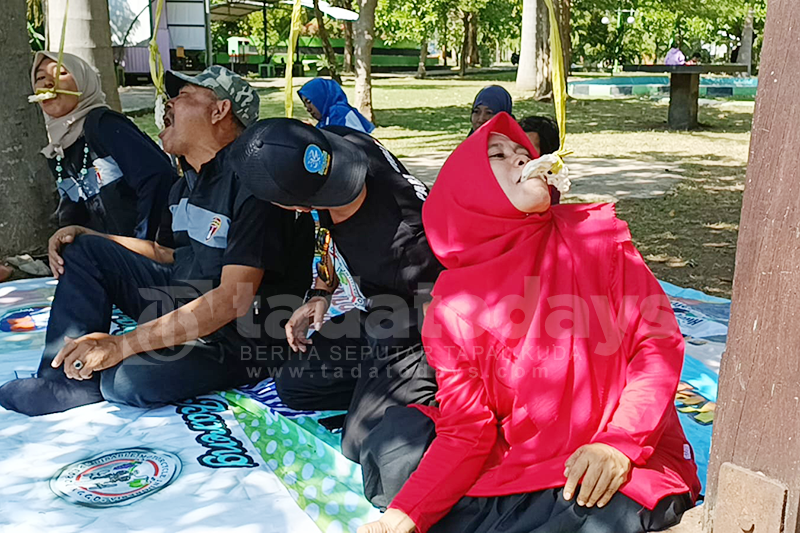 LOMBA AGUSTUSAN: Sebelum upacara, penyandang disabilitas berlomba khas Agustusan, seperti makan kerupuk sembunyi tangan.