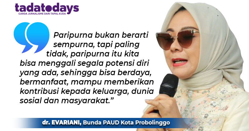 Bunda PAUD yang juga Ketua TP PKK Kota Probolinggo dr Evariani menyatakan bahwa momentum hari ibu sebagai ajang intropeksi bagaimana kita menjadi perempuan harus paripurna. “Paripurna bukan berarti sempurna, tapi paling tidak, paripurna itu kita bisa menggali segala potensi diri yang ada, sehingga bisa berdaya, bermanfaat, mampu memberikan kontribusi kepada keluarga, dunia sosial dan masyarakat. Sehingga, tujuan akhirnya adalah kontribusi nyata seorang perempuan dalam membangun kota probolinggo lebih baik,” terangnya.