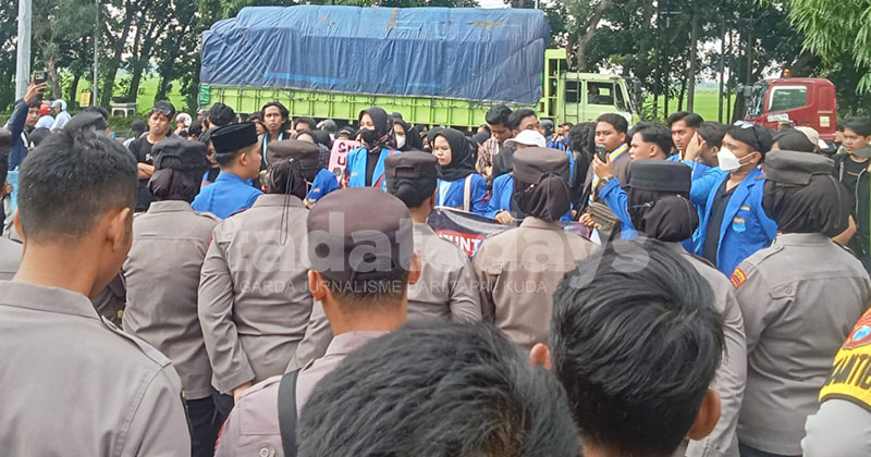 DIJAGA: PC PMII Probolinggo menggelar aksi damai di depan gedung DPRD Kabupaten Probolinggo.