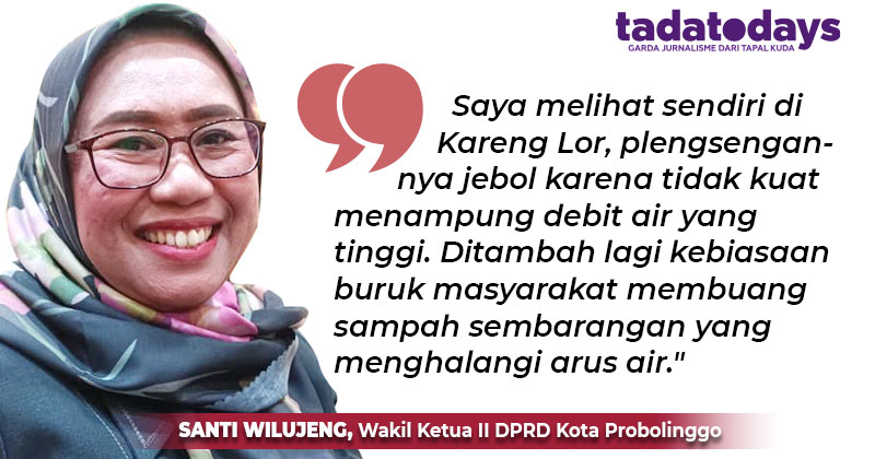 PROBOLINGGO, TADATODAYS.COM - Curah hujan tinggi yang mengguyur Kota Probolinggo pada Sabtu (17/1/2026), berbuntut banjir genangan di puluhan titik, dan mengakibatkan kerusakan infrastruktur. Menyikapi hal tersebut, Wakil Ketua II DPRD Kota Probolinggo Santi Wilujeng menyoroti infrastruktur saluran air dan sistem drainase secara menyeluruh.