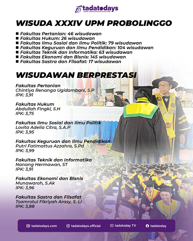 Sebagai wisudawati yang dinobatkan sebagai lulusan terbaik di tingkat fakultas dan universitas, yaitu Lovita Adelia Citra, S.A.P dengan Indeks Prestasi 3,95 berasal dari Fakultas Ilmu Sosial dan Ilmu Politik. Ia mengungkapkan bangga dan terimakasih kepada UPM Probolinggo karena sudah memberikan kesempatan untuk menamatkan diri sebagai lulusan terbaik pada wisuda kali ini.
