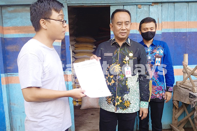 TEGURAN: Sekda Kabupaten Probolinggo, yang juga Ketua Satgas Pupuk Kabupaten Probolinggo, Ugas Irwanto menyerahkan surat pernyataan sekaligus memberi teguran bagi penjual kios pupuk yang menjual pupuk di atas harga eceran tertinggi (HET) di kios pupuk Pasar Bantaran, Kecamatan Bantaran, Kabupaten Probolinggo.