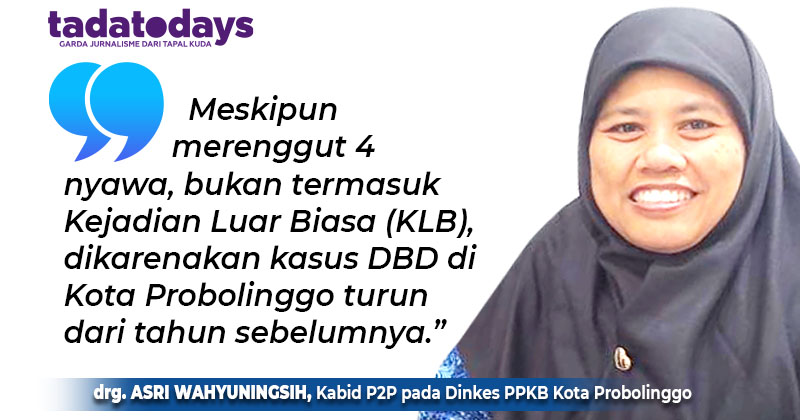 “Total kasus DBD sampai Desember 2025 ada 326 kasus, dengan empat di antaranya meninggal. Rinciannya, 2 kasus di Kecamatan Mayangan dan 2 kasus di Kecamatan Kanigaran. Meskipun merenggut 4 nyawa, bukan termasuk Kejadian Luar Biasa (KLB), dikarenakan kasus DBD di Kota Probolinggo turun dari tahun sebelumnya,” katanya