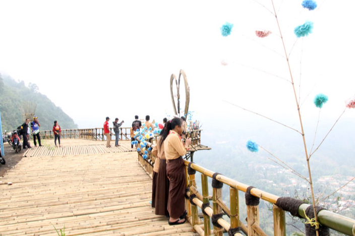 DARI BAMBU: Pengunjung Bukit Seribu Selfie menikmati panorama yang indah berupa perbukitan di lokasi tersebut. Siapa sangka, tempat wisata itu dibangun menggunakan 500 bambu.