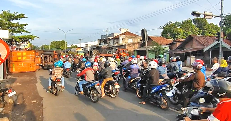 “Saya kaget waktu lihat lampu lalu lintas roboh. Rupanya truk besar itu terguling, sopirnya sendirian. Kayaknya memang ngantuk,” tutur Wahyu (53), warga setempat.